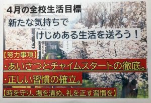 生徒の皆さんは、4月当初の目標であった、「新たな気持ちでけじめある生活」が送れたでしょうか。しっかり見直してみてください。