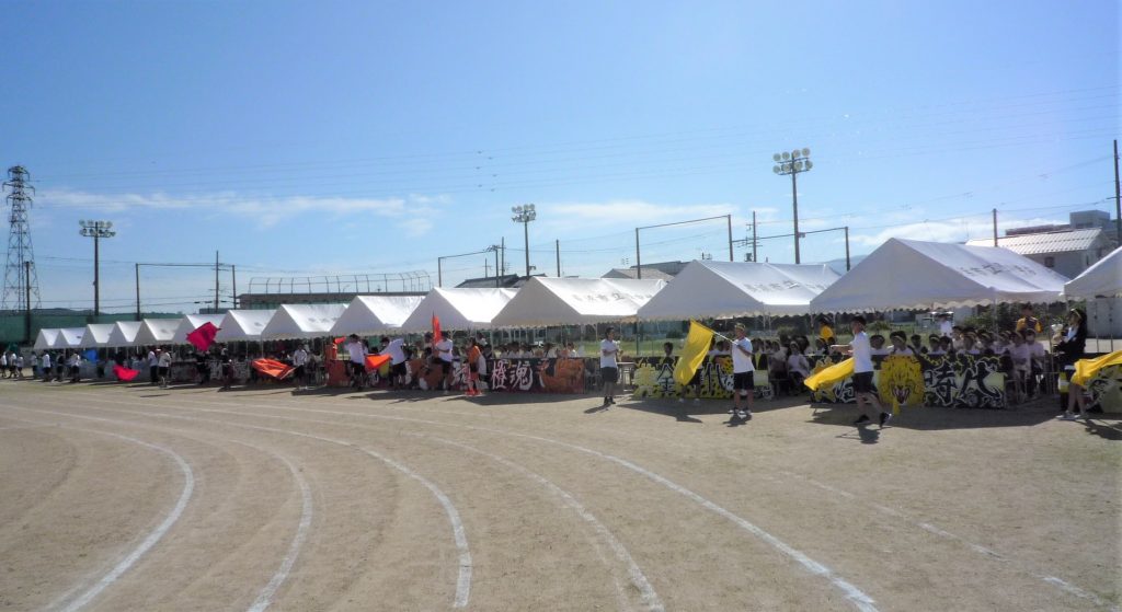 かねてからお伝えしている通り、今年は「体育大会」から「体育祭」と名前をかえ、各学年のクラスをもとに5つの団を編成し、団活動や生徒会種目を主として、生徒が主役となり、仲間と一緒に自ら考え行動する場面を多くとる行事にしました。