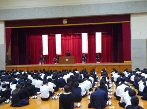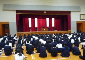 本日 (11/12) 午後、体育館にて全校生徒に対して立会演説会が行われました。今回は、会長候補2名・副会長候補2名が立候補し、まず推薦責任者の推薦演説、続いて立候補者の演説と続きました。いずれも「よりよい西中学校にするため」という共通した願いのもと、自信をもって公約を演説することができました。
