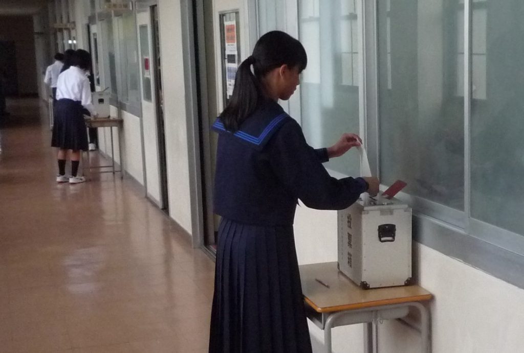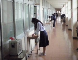 その後、各教室にもどり選挙管理委員の進行のもと、全校生徒による投票がおこなわれました。投票箱は長浜市選挙管理委員会からお借りした実際に使用されるものです。体育館から教室への移動、投票完了まで、私語をする人がいない中、公正公平で厳粛な選挙が行われました。生徒会活動を通して、生徒一人ひとりが民主主義の根幹である選挙の大切さを実感するものになりました。