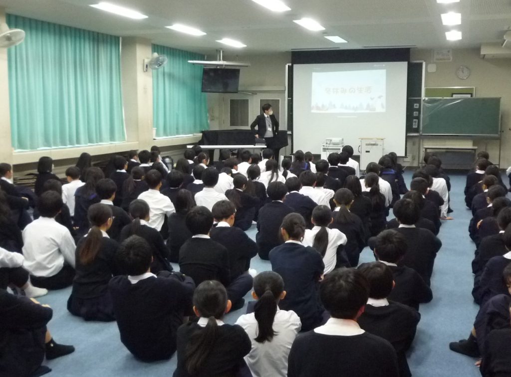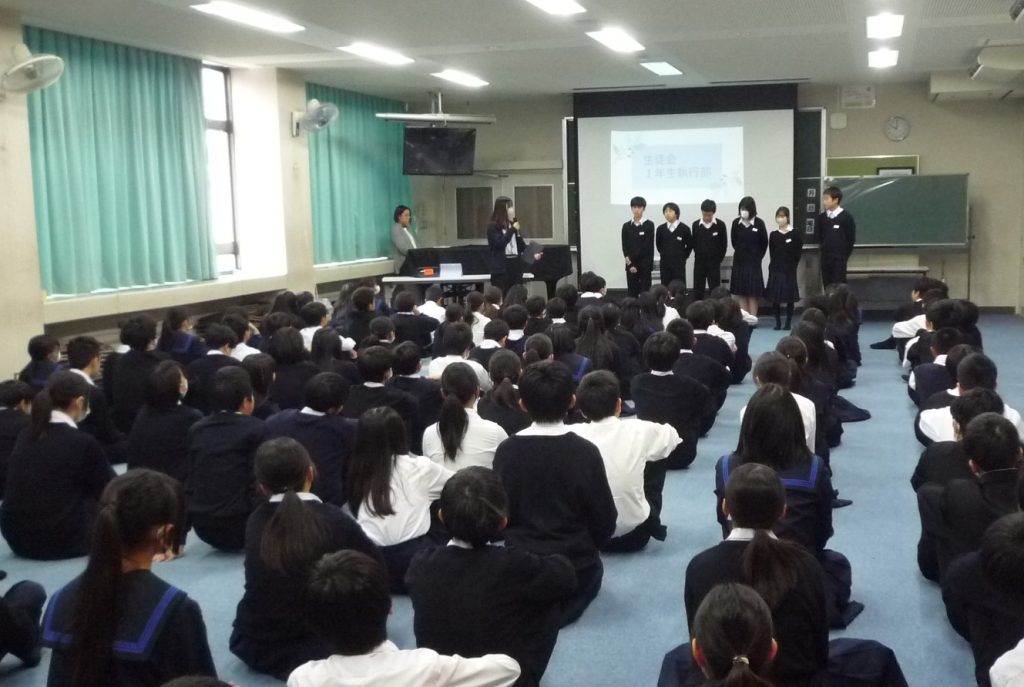 まず各クラスから、2学期の成果と課題・3学期に目標として取り組みたいことなど、タブレットを活用しながら堂々と発表しました。その後、先生方から2学期や冬休みの生活・生徒会などについて、話がありました。