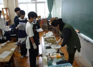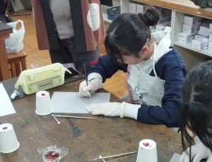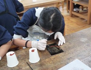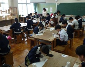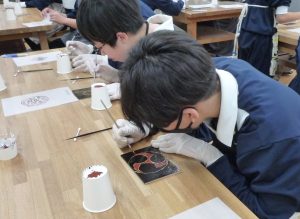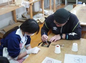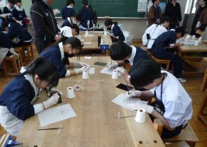 本日(2/6)、1年生において「伝統文化学習」の一環として「曳山文化教室」の第3講が開かれました。これまで曳山博物館見学やくじ取り式・裸参り体験などを経て、今回は「蒔絵(まきえ)体験」を行いました。
