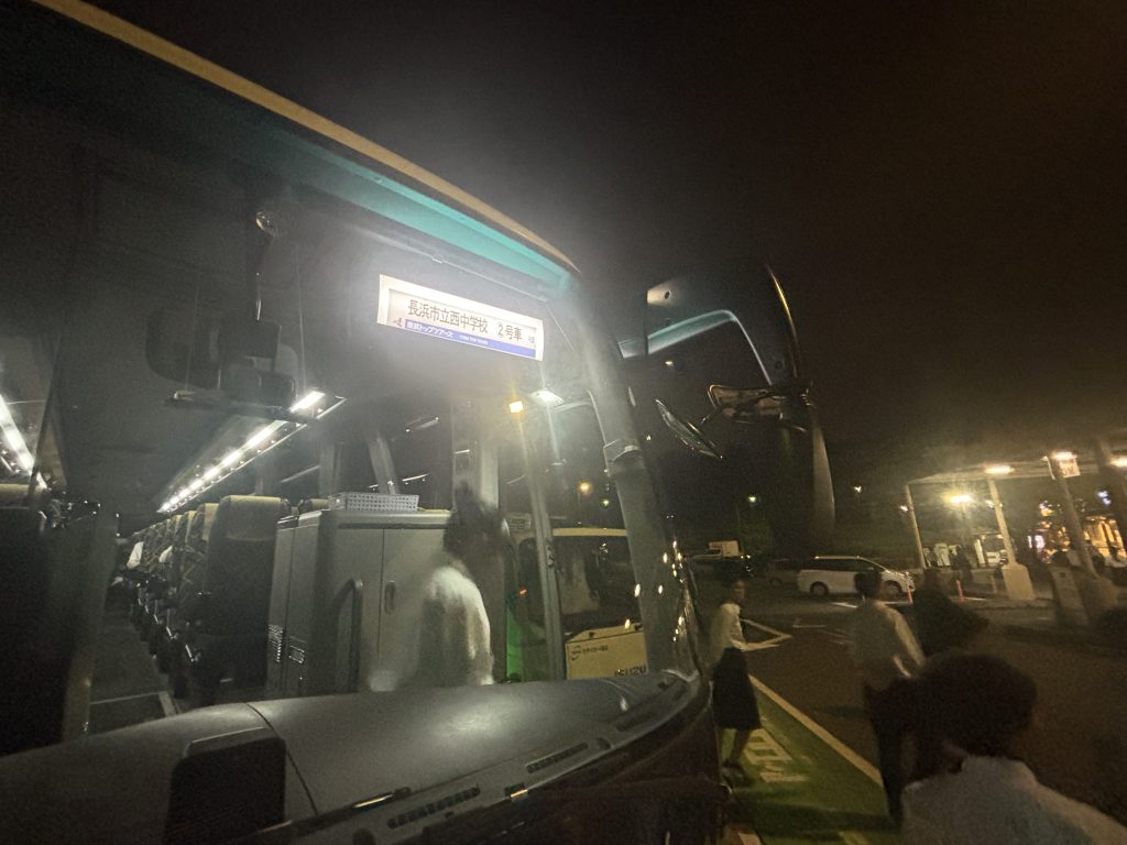 トイレ休憩の後、菩提寺パーキングエリアを出発しました。学校到着予定時刻は、午後8時15分頃です。