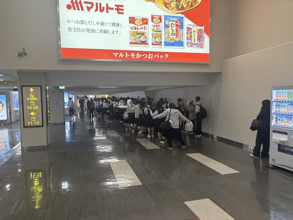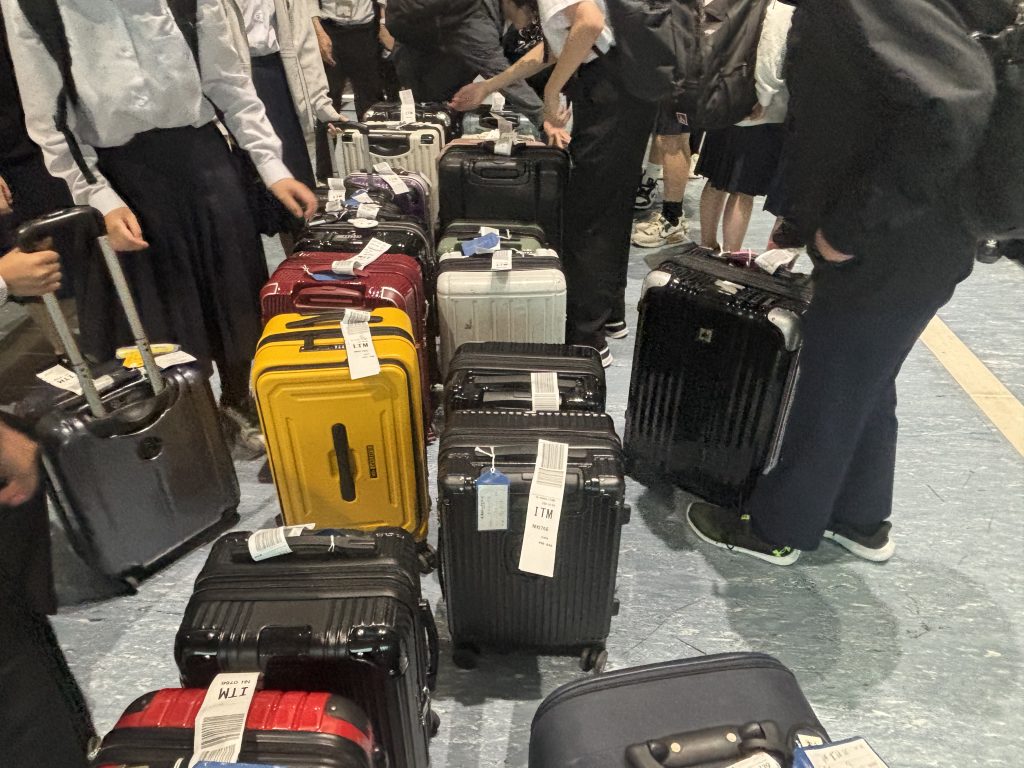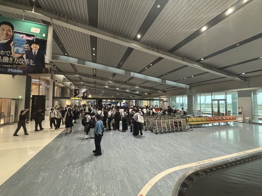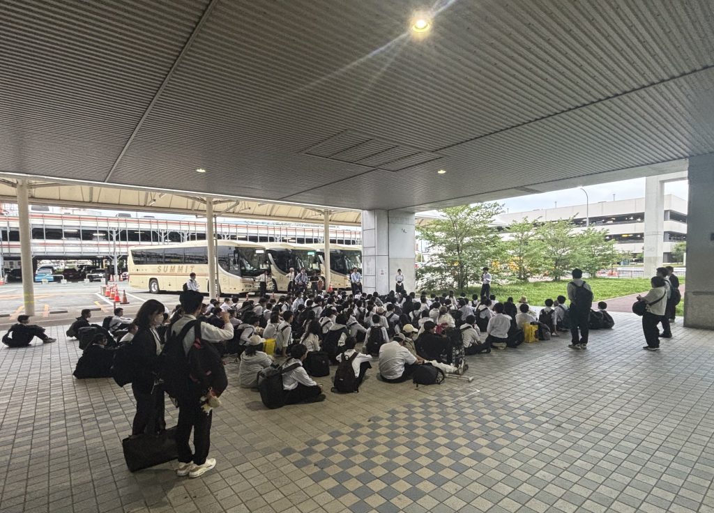 無事に伊丹空港に着きました。荷物を受け取り、バスに乗る前に帰着式を行いました。学校への到着予定時刻は、途中休憩の菩提寺パーキングエリアを出発した時と、米原ジャンクションを通過した時点で「きずなネット」にて連絡いたします。