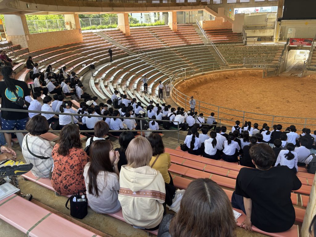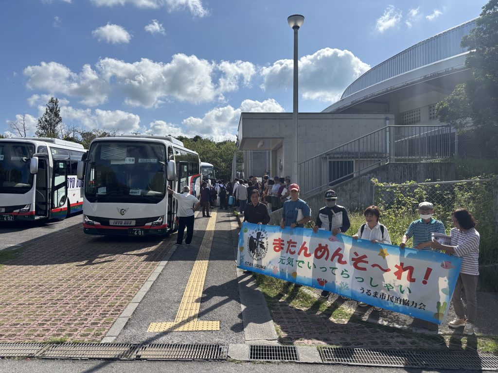 お世話になったうるま市の民家の方々とお別れする「退村式」を行いました。生徒に昨日の様子を聞いてみると、すごく楽しかったようです。特に沖縄のごはんがとても美味しかったことや、いろいろな体験をさせてもらったこと、沖縄の歴史や文化について話を聞かせてもらったことなど、思い出深い貴重な経験をしたようです。民家の皆さん、いろいろとお世話になり本当にありがとうございました。これからバスで「国際通り」へ向かいます。