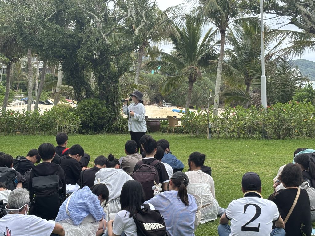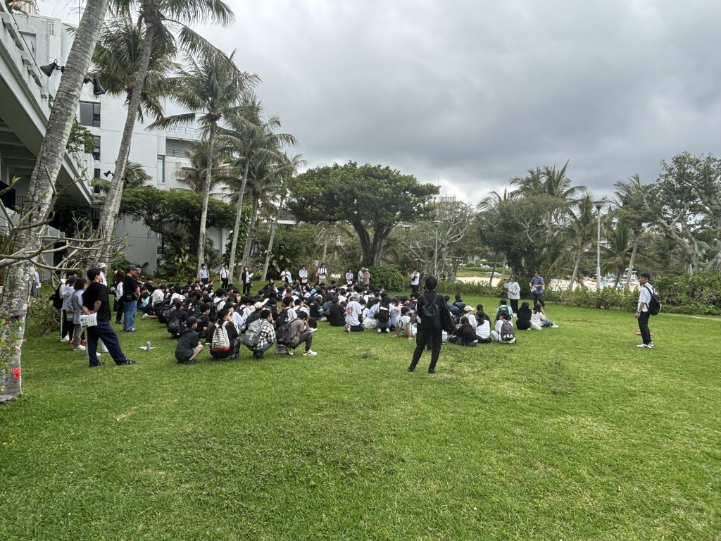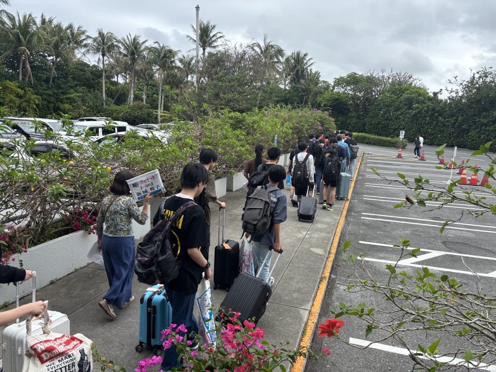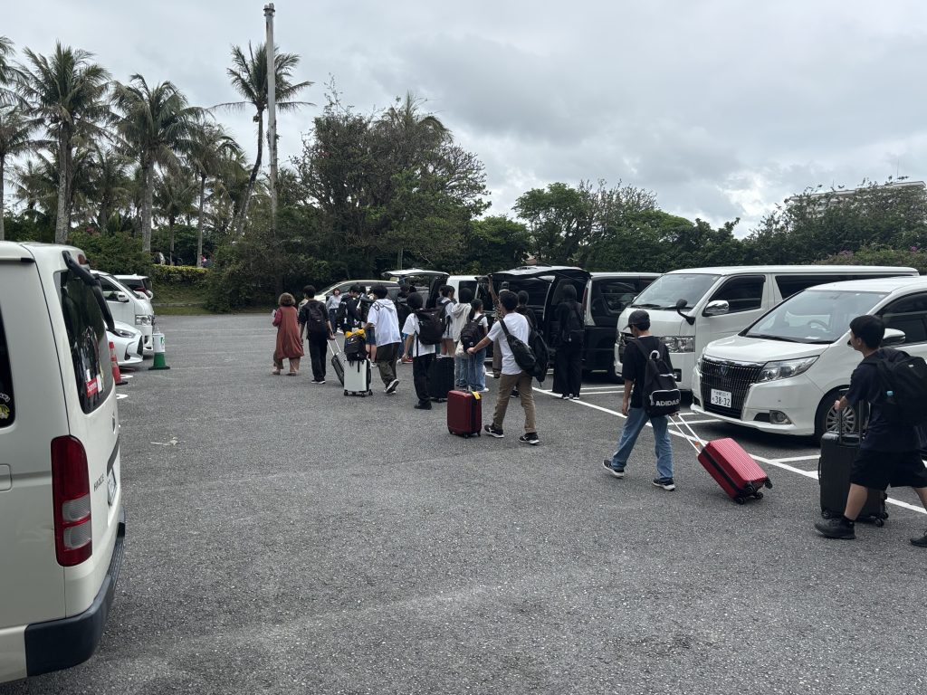 選択別体験学習を終えて、全員ホテルの広場に集合しました。「入村式」を行い、明日の朝まで体験や民泊でお世話になる民家の皆様にご挨拶をしました。民家の皆様、お世話になりますがどうかよろしくお願いします。民泊では、沖縄の自然や文化、生活や伝統を学ぶ貴重な経験にしてほしいと思います。